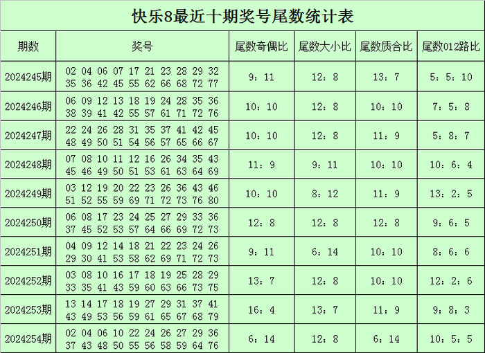 福彩风物8第2024254期开奖归来:02 04 06 10 22 24 26 27 29 36 37 43 48 50 55 56 58 59 64 76,其中奖号余数奇偶比为6:14,余数012路比为10:5:5,余数大小比为12:8,余数质合比为6:14。